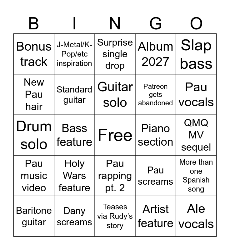 This bingo card has a free space and 24 words: Holy Wars feature, Dany screams, Guitar solo, Baritone guitar, Slap bass, Bonus track, New Pau hair, J-Metal/K-Pop/etc inspiration, Piano section, Pau rapping pt. 2, Patreon gets abandoned, Drum solo, Pau screams, More than one Spanish song, Standard guitar, Artist feature, QMQ MV sequel, Surprise single drop, Pau vocals, Bass feature, Ale vocals, Pau music video, Album 2027 and Teases via Rudy’s story.