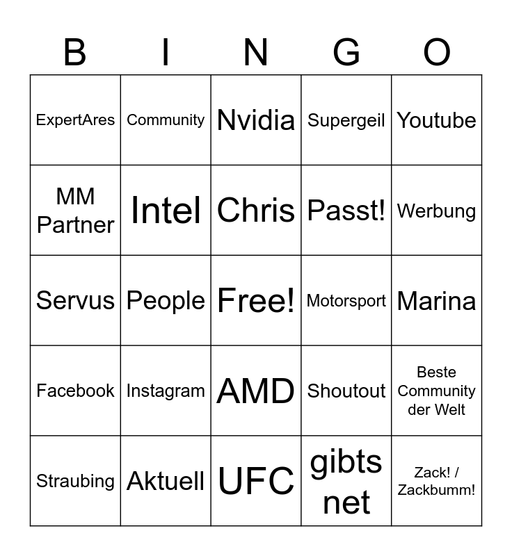 This bingo card has a free space and 30 words: Aktuell, Leude, People, Cookie, ExpertAres, Nvidia, Intel, AMD, Motorsport, UFC, Marina, Zack! / Zackbumm!, gibts net, Prost, Werbung, Raid, Shoutout, Facebook, Instagram, Youtube, Servus, Steam / Steamgruppe, Community, Passt!, MM Partner, Supergeil, Beste Community der Welt, Straubing, Chris and Bayrisch / Bavarian.