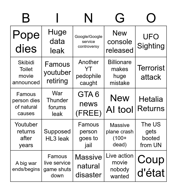 This bingo card has a free space and 24 words: Supposed HL3 leak, Famous live service game shuts down, Another YT pedophile caught, A big war ends/begins, UFO Sighting, Pope dies, Skibidi Toilet movie announced, Huge data leak, New AI tool, Famous person goes to jail, Billionare makes huge mistake, Famous person dies of natural causes, Massive plane crash (100+ dead), The US gets booted from UN, Famous youtuber retiring, Live action movie nobody wanted, Hetalia Returns, Google/Google service controversy, Terrorist attack, War Thunder forums leak, Coup d'état, Youtuber returns after years, New console released and Massive natural disaster.
