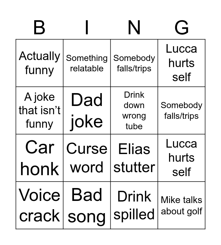 This bingo card has 19 words: Elias stutter, Dave mean to waiter, Somebody falls/trips, Mike talks about golf, Lucca hurts self, A joke that isn’t funny, Drink spilled, Actually funny, Something relatable, Car honk, Curse word, Dad joke, Drink down wrong tube, Bad song, Voice crack, Song about trucks and girls, Lucca hurts self, Somebody falls/trips and A.