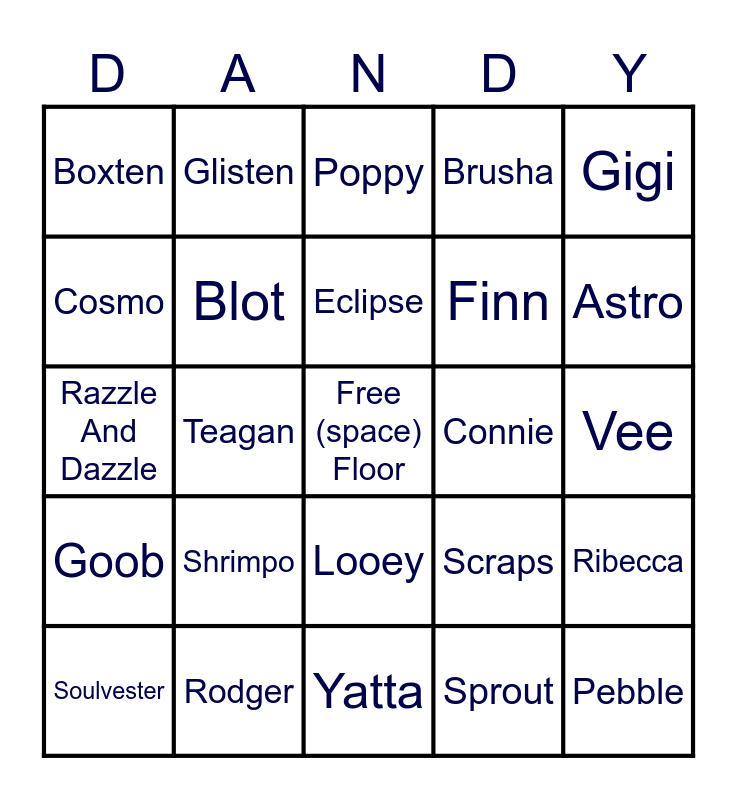 This bingo card has a free space and 30 words: Rodger, Toodles, Teagan, Tisha, Boxten, Poppy, Blot, Looey, Connie, Yatta, Vee, Pebble, Sprout, Shelly, Astro, Brightney, Scraps, Goob, Shrimpo, Gigi, Razzle And Dazzle, Flutter, Glisten, Finn, Cosmo, Brusha, Ribecca, Soulvester, Eclipse and Gourdy.