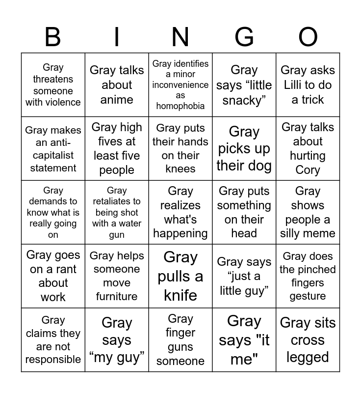 This bingo card has a free space and 27 words: Gray says “just a little guy”, Gray flares their eyes and stares into the void, Gray picks up their dog, Gray finger guns someone, Gray makes an anti-capitalist statement, Gray identifies a minor inconvenience as homophobia, Gray talks about anime, Gray goes on a rant about work, Gray puts something on their head, Gray does the pinched fingers gesture, Gray demands to know what is really going on, Gray says “little snacky”, Gray claims they are not responsible, Gray says “my guy”, Gray talks about hurting Cory, Gray lets out a deep sigh, Gray high fives at least five people, Gray puts their hands on their knees, Gray helps someone move furniture, Gray threatens someone with violence, Gray shows people a silly meme, Gray says "it me", Gray retaliates to being shot with a water gun, Gray sits cross legged, Gray pulls a knife, Gray asks Lilli to do a trick and Gray says "hot girl summer".