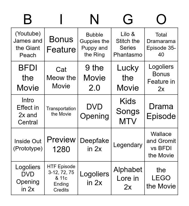 This bingo card has 43 words: Opening AMC Preview, DVD Opening, Logoliers Opening AMC Preview in 2x, Logoliers DVD Opening in 2x, Film Movie, Alphabet Lore in 2x, Bubble Guppies the Puppy and the Ring, BFDI Episode 10-12, Total Dramarama Episode 35-40, HTF Episode 3-12, 72, 75 & 11c Ending Credits, Lilo & Stitch the Series Phantasmo, Kids Songs MTV, Deepfake in 2x, Preview 1280, Title Nasir790, Logoliers in 2x, Mr Incredible Becoming Old, Intro Effect in 2x and Central, Wallace and Gromit Grand Adventures in 2x, Logoliers Bonus Feature in 2x, Bonus Feature, Magic the America Sauce, Disney Pixar & Nickelodeon & Other Toy Story 3, (Youtube) James and the Giant Peach, (Youtube) Elemental, Drama Episode, HTF Definitely Not a Shadbid, YouTube Coraline, Legendary, Inside Out (Prototype), Lightyear (Prototype), Wallace and Gromit vs BFDI the Movie, Scary Movie, Transportation the Movie, the Learning Station the Movie, PJ Masks the Movie, the LEGO the Movie, 9 the Movie 2.0, BFDI the Movie, Lucky the Movie, DVD the Movie, Cat Meow the Movie and DVD Closing.