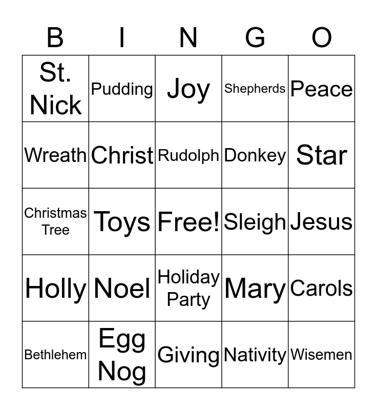This bingo card has a free space and 24 words: Noel, Egg Nog, Rudolph, Bethlehem, Peace, St. Nick, Wreath, Pudding, Sleigh, Holiday Party, Donkey, Christmas Tree, Mary, Carols, Christ, Nativity, Jesus, Joy, Star, Toys, Wisemen, Holly, Shepherds and Giving.