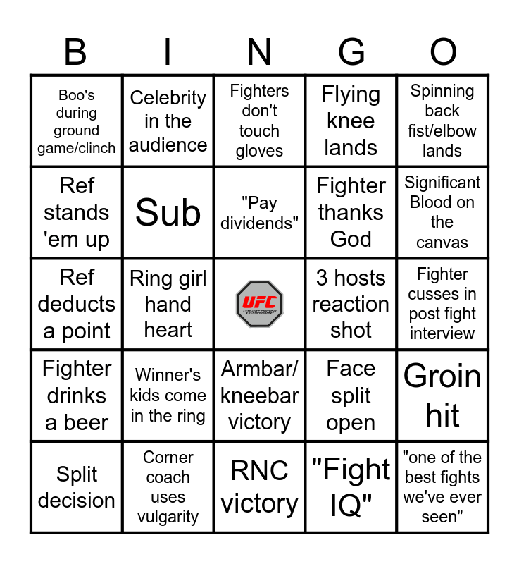 This bingo card has a free space and 49 words: Fighter sits on the bar, "one of the best fights we've ever seen", Unanimous decision, RNC victory, Winner's kids come in the ring, K.O, Celebrity in the audience, Buffer fist bumps fighter, Ref stands 'em up, Tweet from The Rock, Sub, Flying knee lands, Groin hit, Face split open, TKO, 1st round finish, "Pay dividends", 3 hosts reaction shot, Doctor stoppage, Spinning back fist/elbow lands, Ring girl hand heart, "Fight IQ", Boo's during ground game/clinch, Fighter thanks God, Fighter missed weight, Significant Blood on the canvas, Split decision, Guillotine victory, Armbar/ kneebar victory, Fighter drinks a beer, Winner gets emotional after win, Fighter gets slammed, "He had a tough training camp", "That's deep", Corner coach uses vulgarity, Eye poke, commentator desk has insane reaction, Fighter has one eye swollen shut, Fighter cusses in post fight interview, Mouthpiece falls out, Fighter asks for title shot, Camera pans away from Megan Olivi, Fighter complains about stoppage, Fence grab, Ref deducts a point, Fighters don't touch gloves, Fighter sits on the bar, Fighter sits on the bar and Fighter sits on the bar.
