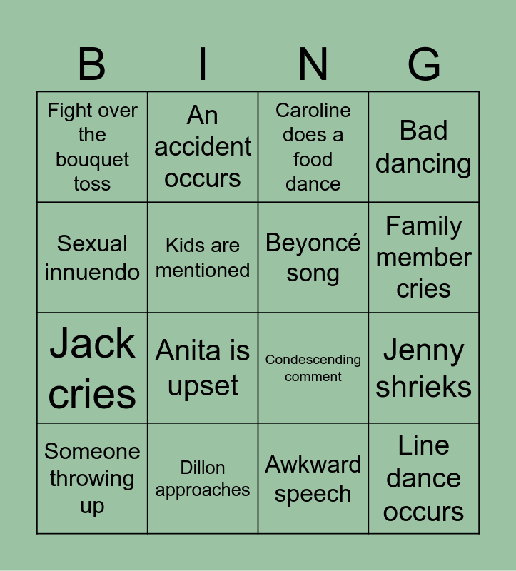 This bingo card has 16 words: Dillon approaches, Jenny shrieks, Caroline does a food dance, Fight over the bouquet toss, Jack cries, An accident occurs, Condescending comment, Awkward speech, Sexual innuendo, Kids are mentioned, Someone throwing up, Bad dancing, Anita is upset, Family member cries, Beyoncé song and Line dance occurs.