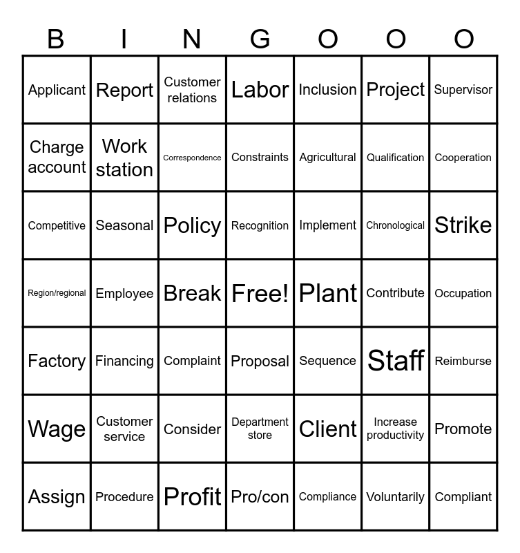 This bingo card has a free space and 100 words: Administrative assistant, Client, Competitive, Cubicle, Efficient/efficiency, Equality or fair treatment, Headquarters, Incentive, Manager, Memorandum (memo), Personnel/human resources, Productivity, Profit, Region/regional, Sales territory, Staff, Work station, Commission, Cut costs, Increase costs, Boost employee morale, Decreasing employee moral, Increase productivity, Decreased productivity, Customer service, Cooperation, Inclusion, Implement, Costs, Address, Agricultural, Applicant, Authorize, Assign, Break, Charge account, Chronological, Competent, Complaint, Compliant, Compliance, Consider, Constraints, Contribute, Correspondence, Customer relations, Decrease, Department store, Disposal, Employee, Extent, Factory, Financing, Hazardous, Human resources, In favor of, Institute, Inquiring, Key information, Labor, Layoff, Leave, Letter, Machinery, Manufacturing, Memo or memorandum, Migrant, Occupation, Peer, Personnel, Plant, Policy, Primary, Principle, Pro/con, Procedure, Production, Project, Promote, Proposal, Proposed, Qualification, Quota, Recognition, Reimburse, Report, Representatives, Request, Require, Seasonal, Sequence, Shift, Standard, Strike, Supervisor, Team, Voluntarily, Wage, Waste and Zone.