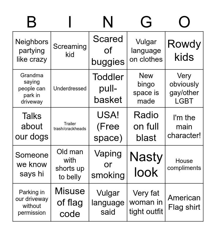This bingo card has a free space and 53 words: MAGA hat, American Flag shirt, American Flag overalls, Very fat woman in tight outfit, Old man with shorts up to belly, Family of 10, Screaming kid, Dad's clients, Grandma saying people can park in driveway, Overdressed, Underdressed, Brant, House compliments, Nasty look, Traffic a mile long, Parking in our driveway without permission, Toddler pull-basket, Radio on full blast, Totaled car, Rowdy kids, Trailer trash/crackheads, Dad gets drunk, New bingo space is made, Neighbors partying like crazy, Second Amendment-related attire, Misuse of flag code, Bald, Scraggly hair, Dyed hair, Very obviously gay/other LGBT, Anti-Trump person, Shoeless, Brought toys for the kids!, Midday fireworks, Jogger, A very lonely person, Vulgar language on clothes, Vulgar language said, Scared of buggies, Family of ten Amish, Alcohol-related attire, Jesus H. Christ!, I'm the main character!, Shirtless, Dumb kids, Vaping or smoking, Trump 2024 still!, Innuendo, Talks about our dogs, Someone we know says hi, Repeat of a called bingo space, Bumper stickers and Scared horse.
