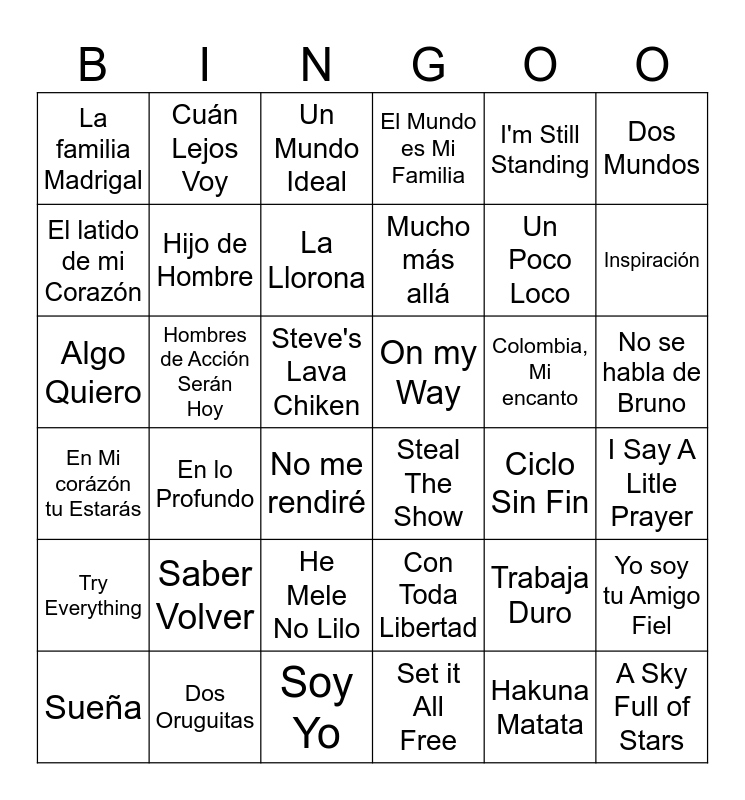 This bingo card has 47 words: Free!, Algo Quiero, Bajo el Mar, Ciclo Sin Fin, Colombia, Mi encanto, Con Toda Libertad, Cuán Lejos Voy, De Nada, Dos Mundos, Dos Oruguitas, El latido de mi Corazón, El Mundo es Mi Familia, En lo Profundo, En Mi corázón tu Estarás, Hakuna Matata, He Mele No Lilo, Hijo de Hombre, Hombres de Acción Serán Hoy, How Far I'll Go, I'm Still Standing, Inspiración, I Say A Litle Prayer, La familia Madrigal, La Llorona, Llegaré, Mucho más allá, No me rendiré, No Importa la Distancia, No se habla de Bruno, On my Way, Recuerdame, Saber Volver, Set it All Free, A Sky Full of Stars, Soy Yo, Steal The Show, Steve's Lava Chiken, Sueña, Tippy Toes, Trabaja Duro, Try Everything, Un Mundo Ideal, Un Poco Loco, Viento y Cielo Alcanzar, Yo Siempre Quise un Hermano, Yo soy tu Amigo Fiel and ¿Y si hacemos un muñeco?.