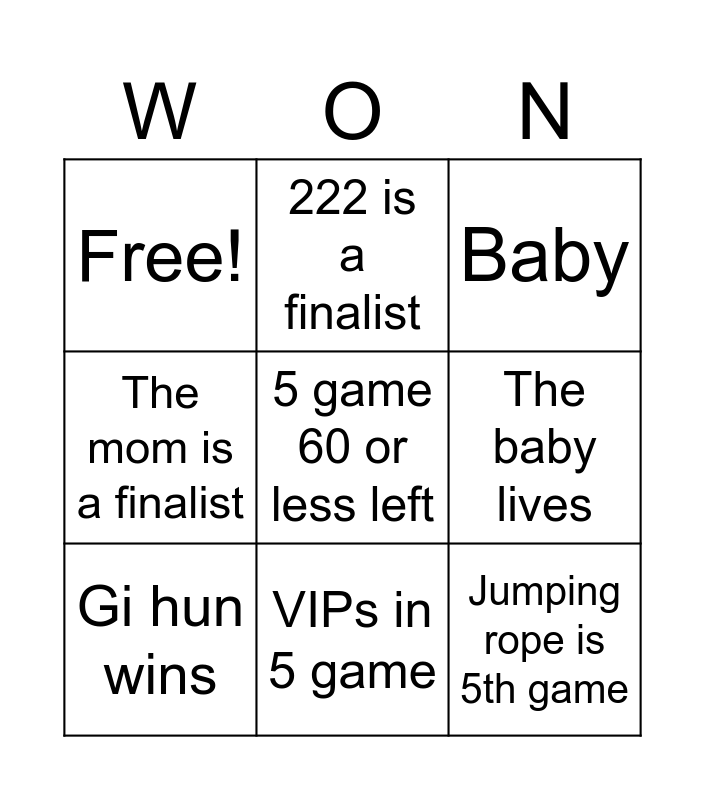 This bingo card has 9 words: Gi hun wins, Baby, 222 is a finalist, The mom is a finalist, Free!, The baby lives, 5 game 60 or less left, Jumping rope is 5th game and VIPs in 5 game.