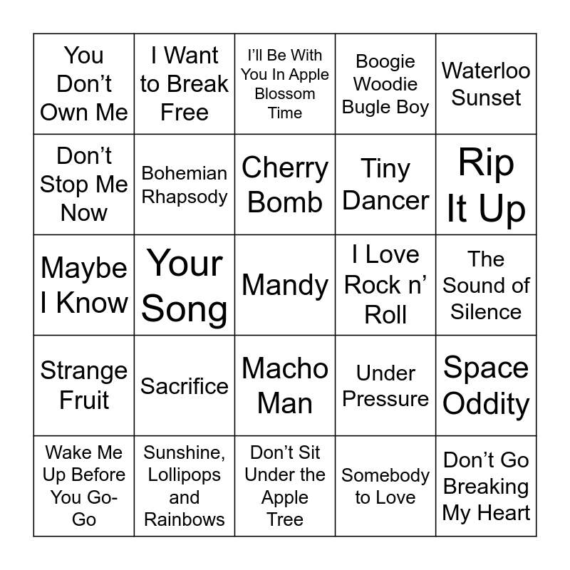 This bingo card has 53 words: It Never Rains in Southern California, Mandy, Copacabana, Somebody to Love, Sacrifice, Rocket Man, I Want to Break Free, I Guess That’s Why They Call It The Blues, Don’t Stop Me Now, We Are The Champions, Bohemian Rhapsody, Somebody To Love, Space Oddity, Under Pressure, Careless Whisper, Wake Me Up Before You Go-Go, Cherry Bomb, I Love Rock n’ Roll, You Really Got Me, Waterloo Sunset, Your Song, Don’t Go Breaking My Heart, Tiny Dancer, You Don’t Own Me, It’s My Party, Sunshine, Lollipops and Rainbows, Heart of Glass, Tutti Frutti, Good Golly Miss Molly, Rip It Up, Piece of My Heart, Me and Bobby McGee, Blue Moon, I’ll Be Seeing You, Solitude, Crazy He Calls Me, Boogie Woodie Bugle Boy, Don’t Sit Under the Apple Tree, I’ll Be With You In Apple Blossom Time, Pistol Packin’ Mama, Cecilia, Mrs. Robinson, The Sound of Silence, The Only Living Boy in New York, YMCA, Macho Man, I Only Want to Be With You, You Make Me Feel (Mighty Real), Maybe I Know, Strange Fruit, Can You Feel the Love Tonight, We Will Rock You and All of Me.