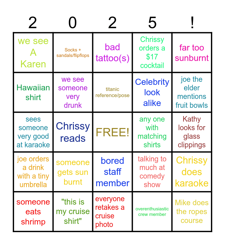 This bingo card has a free space and 24 words: someone gets sun burnt, "this is my cruise shirt", titanic reference/pose, someone eats shrimp, far too sunburnt, we see A Karen, Hawaiian shirt, Socks + sandals/flipflops, any one with matching shirts, bored staff member, Celebrity look alike, sees someone very good at karaoke, talking to much at comedy show, Chrissy does karaoke, we see someone very drunk, overenthusiastic crew member, Kathy looks for glass clippings, bad tattoo(s), joe the elder mentions fruit bowls, Chrissy reads, Mike does the ropes course, joe orders a drink with a tiny umbrella, Chrissy orders a $17 cocktail and everyone retakes a cruise photo.