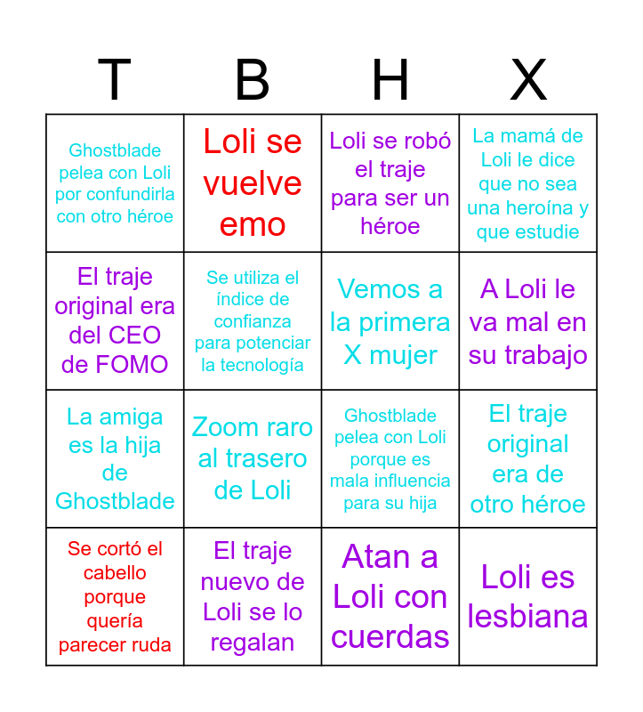 This bingo card has 16 words: El traje nuevo de Loli se lo regalan, El traje original era de otro héroe, Loli se robó el traje para ser un héroe, Ghostblade pelea con Loli por confundirla con otro héroe, La amiga es la hija de Ghostblade, Loli se vuelve emo, Ghostblade pelea con Loli porque es mala influencia para su hija, Atan a Loli con cuerdas, El traje original era del CEO de FOMO, Se utiliza el índice de confianza para potenciar la tecnología, Se cortó el cabello porque quería parecer ruda, La mamá de Loli le dice que no sea una heroína y que estudie, Zoom raro al trasero de Loli, A Loli le va mal en su trabajo, Vemos a la primera X mujer and Loli es lesbiana.