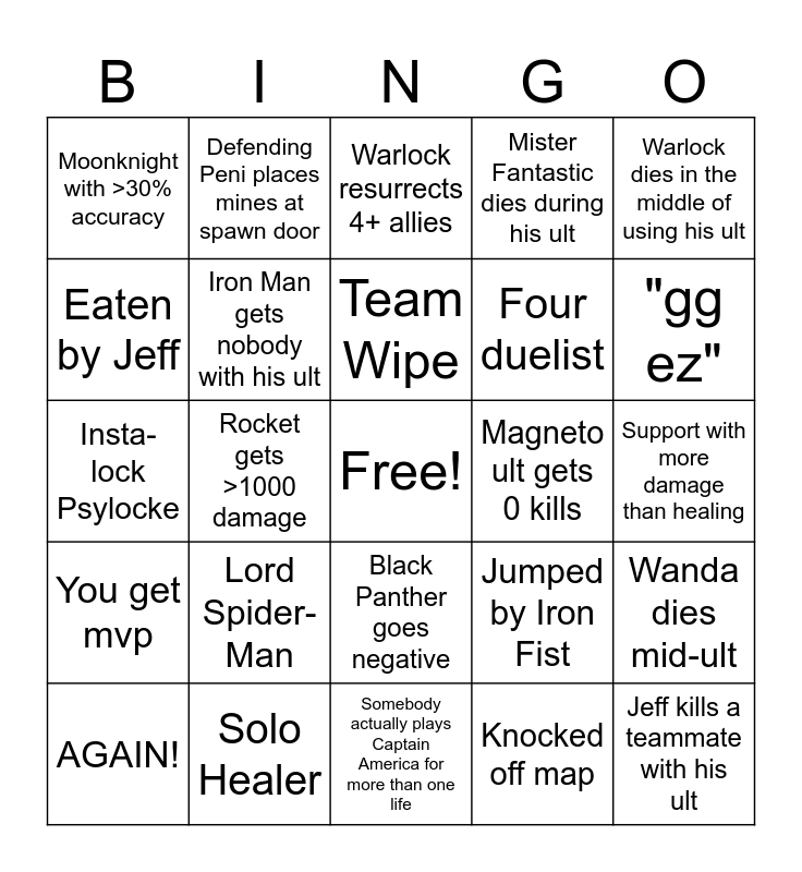 This bingo card has a free space and 24 words: Lord Spider-Man, Solo Healer, Team Wipe, AGAIN!, Warlock dies in the middle of using his ult, Moonknight with >30% accuracy, Eaten by Jeff, Defending Peni places mines at spawn door, Magneto ult gets 0 kills, Black Panther goes negative, Four duelist, Insta-lock Psylocke, Jumped by Iron Fist, Wanda dies mid-ult, Iron Man gets nobody with his ult, Knocked off map, Support with more damage than healing, Warlock resurrects 4+ allies, "gg ez", Rocket gets >1000 damage, Jeff kills a teammate with his ult, You get mvp, Mister Fantastic dies during his ult and Somebody actually plays Captain America for more than one life.