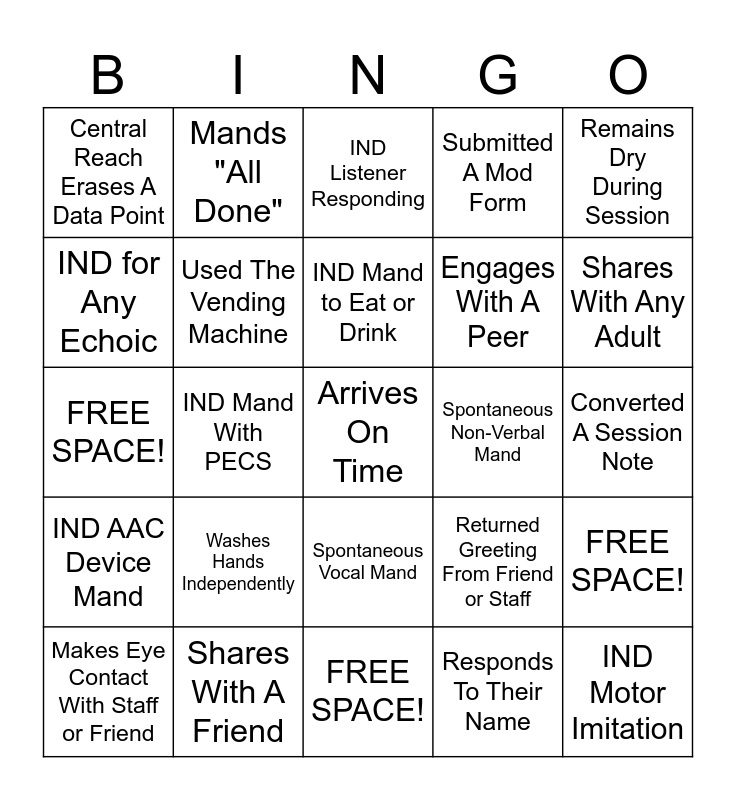 This bingo card has 25 words: IND AAC Device Mand, Shares With A Friend, Arrives On Time, Responds To Their Name, Remains Dry During Session, Central Reach Erases A Data Point, Mands "All Done", IND Listener Responding, Spontaneous Non-Verbal Mand, FREE SPACE!, IND for Any Echoic, Used The Vending Machine, FREE SPACE!, Returned Greeting From Friend or Staff, Shares With Any Adult, Makes Eye Contact With Staff or Friend, IND Mand With PECS, IND Mand to Eat or Drink, Engages With A Peer, Converted A Session Note, FREE SPACE!, Washes Hands Independently, Spontaneous Vocal Mand, Submitted A Mod Form and IND Motor Imitation.