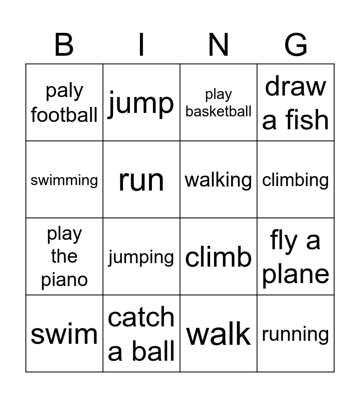 This bingo card has 16 words: catch a ball, fly a plane, play basketball, paly football, play the piano, jump, climb, walk, swimming, run, swim, draw a fish, jumping, climbing, walking and running.