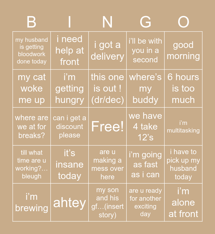 This bingo card has a free space and 24 words: i’m brewing, it’s insane today, this one is out !(dr/dec), are u ready for another exciting day, good morning, my husband is getting bloodwork done today, i need help at front, i got a delivery, we have 4 take 12’s, i’m multitasking, where are we at for breaks?, i’m getting hungry, i’m going as fast as i can, i have to pick up my husband today, my cat woke me up, ahtey, my son and his gf…(insert story), i’ll be with you in a second, 6 hours is too much, till what time are u working?…bleugh, can i get a discount please, are u making a mess over here, where’s my buddy and i’m alone at front.