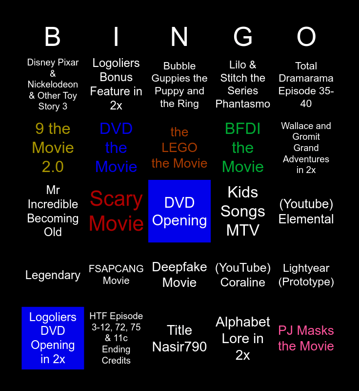 This bingo card has 43 words: Opening AMC Preview, DVD Opening, Logoliers Opening AMC Preview in 2x, Logoliers DVD Opening in 2x, Film Movie, Alphabet Lore in 2x, Bubble Guppies the Puppy and the Ring, BFDI Episode 10-12, Total Dramarama Episode 35-40, HTF Episode 3-12, 72, 75 & 11c Ending Credits, Lilo & Stitch the Series Phantasmo, Kids Songs MTV, Deepfake Movie, FSAPCANG Movie, Preview 1280, Title Nasir790, Logoliers in 2x, Mr Incredible Becoming Old, Intro Effect in 2x and Central, Wallace and Gromit Grand Adventures in 2x, Logoliers Bonus Feature in 2x, Bonus Feature, Magic the America Sauce, Disney Pixar & Nickelodeon & Other Toy Story 3, (Youtube) James and the Giant Peach, (Youtube) Elemental, Drama Episode, Video Editor: HTF Definitely Not a Shadbid, (YouTube) Coraline, Legendary, Inside Out (Prototype), Lightyear (Prototype), Wallace and Gromit vs BFDI the Movie, Scary Movie, Transportation the Movie, the Learning Station the Movie, PJ Masks the Movie, the LEGO the Movie, 9 the Movie 2.0, BFDI the Movie, Lucky the Movie, DVD the Movie and Cat Meow the Movie.
