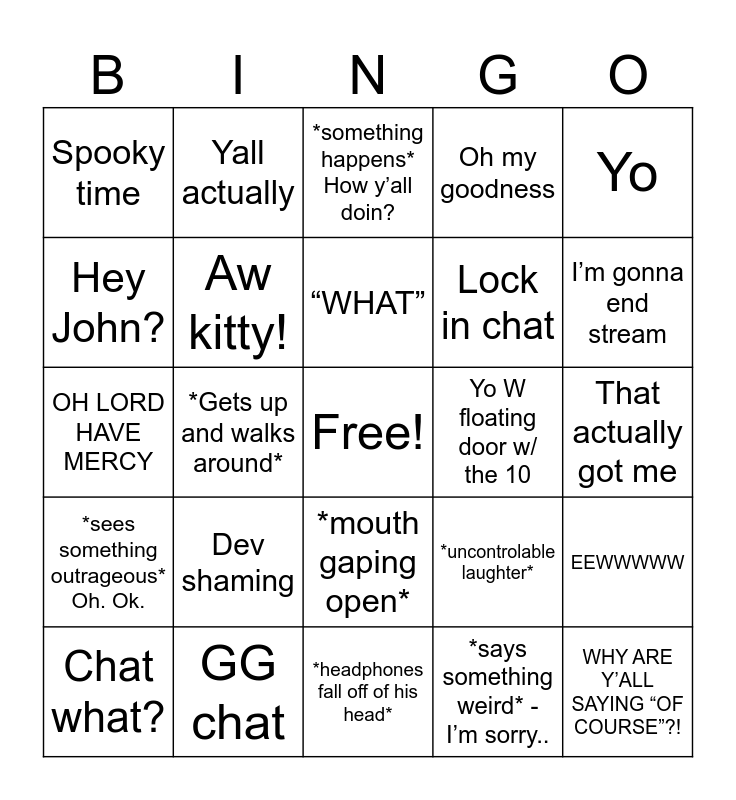 This bingo card has a free space and 24 words: Dev shaming, GG chat, “WHAT”, Chat what?, Yo, Spooky time, Hey John?, Yall actually, Yo W floating door w/ the 10, *mouth gaping open*, Lock in chat, OH LORD HAVE MERCY, *uncontrolable laughter*, EEWWWWW, Aw kitty!, *says something weird* -I’m sorry.., That actually got me, *something happens* How y’all doin?, I’m gonna end stream, *Gets up and walks around*, WHY ARE Y’ALL SAYING “OF COURSE”?!, *sees something outrageous* Oh. Ok., Oh my goodness and *headphones fall off of his head*.