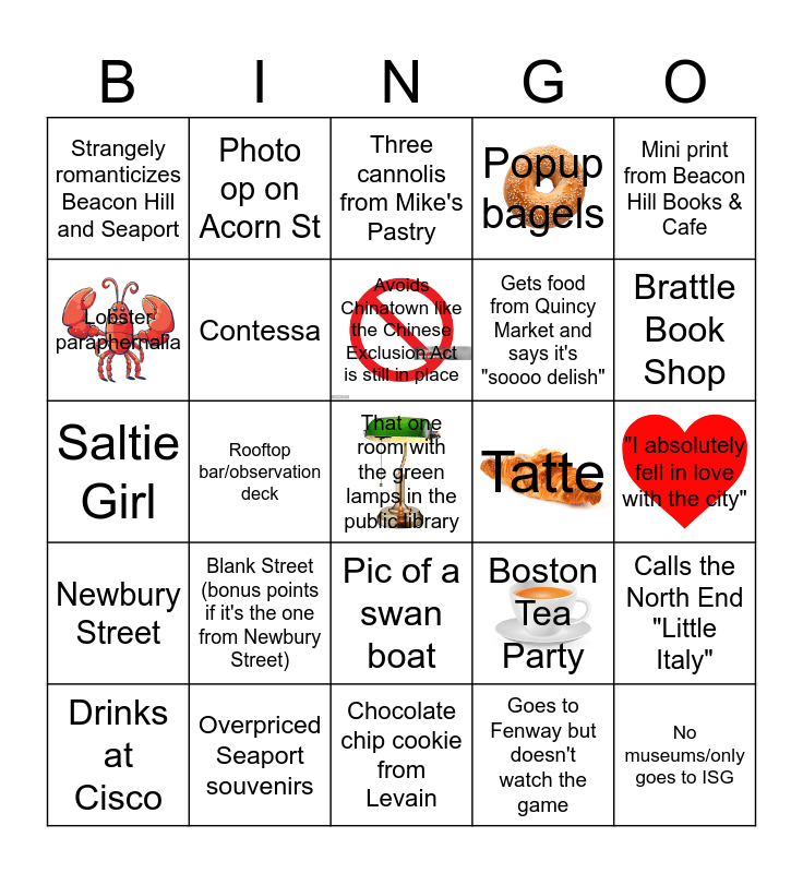 This bingo card has 6 images, a free space and 24 words: Blank Street (bonus points if it's the one from Newbury Street), Overpriced Seaport souvenirs, Avoids Chinatown like the Chinese Exclusion Act is still in place, Drinks at Cisco, Mini print from Beacon Hill Books & Cafe, Strangely romanticizes Beacon Hill and Seaport, Lobster paraphernalia, Photo op on Acorn St, Tatte, Pic of a swan boat, Gets food from Quincy Market and says it's "soooo delish", Saltie Girl, Boston Tea Party, Calls the North End "Little Italy", Contessa, Goes to Fenway but doesn't watch the game, "I absolutely fell in love with the city", Three cannolis from Mike's Pastry, Brattle Book Shop, Rooftop bar/observation deck, No museums/only goes to ISG, Newbury Street, Popup bagels and Chocolate chip cookie from Levain.