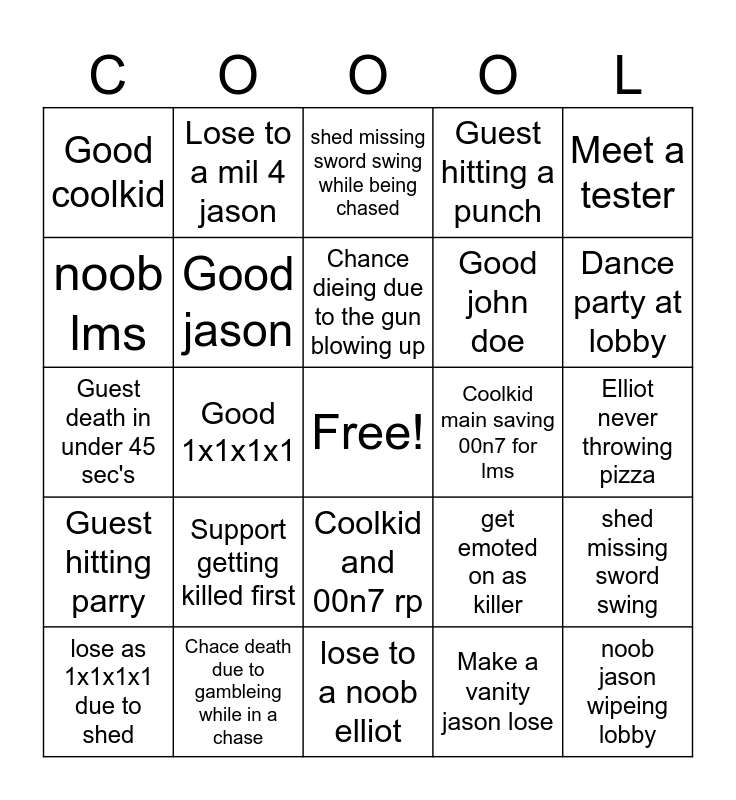 This bingo card has a free space and 24 words: Support getting killed first, Chace death due to gambleing while in a chase, Chance dieing due to the gun blowing up, lose as 1x1x1x1 due to shed, Meet a tester, Good coolkid, noob lms, Lose to a mil 4 jason, Coolkid main saving 00n7 for lms, Coolkid and 00n7 rp, Good john doe, Guest death in under 45 sec's, get emoted on as killer, shed missing sword swing, Good jason, Make a vanity jason lose, Elliot never throwing pizza, shed missing sword swing while being chased, Dance party at lobby, Good 1x1x1x1, noob jason wipeing lobby, Guest hitting parry, Guest hitting a punch and lose to a noob elliot.