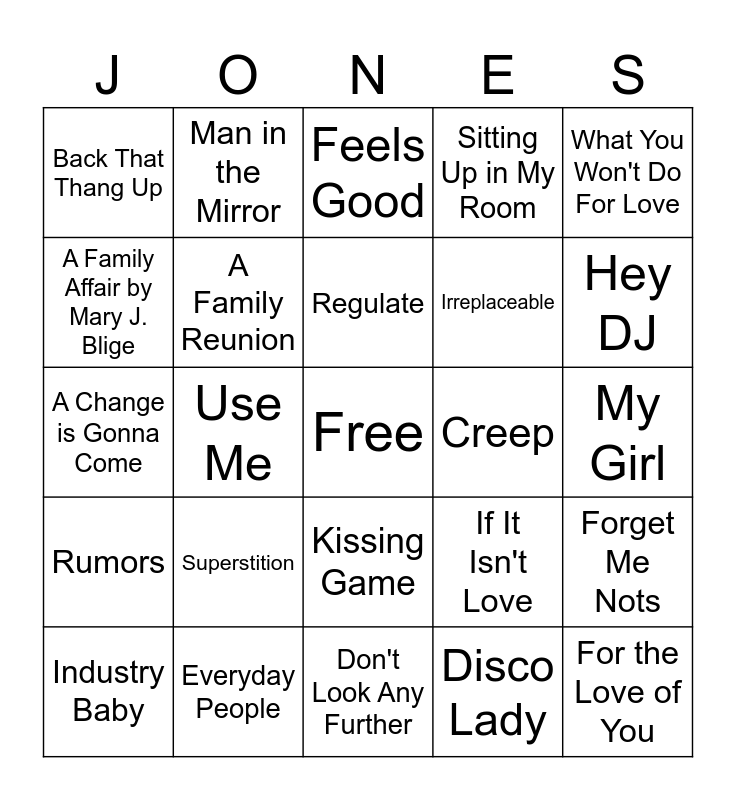 This bingo card has a free space and 40 words: Tenderoni, A Change is Gonna Come, We Are Family, A Family Reunion, Everyday People, Kissing Game, Regulate, Outstanding, What You Won't Do For Love, Rumors, Use Me, Sitting Up in My Room, For the Love of You, My Girl, Creep, Superstition, Hosannah, Back That Thang Up, Let's Groove Tonight, Feels Good, Forget Me Nots, Disco Lady, Irreplaceable, A Family Affair by Mary J. Blige, A Family Affair by Sly & the Family Stone, Upgrade, Humble, Charlie, Last Name, Wilson, No Guidance, Dear Mama, Candy, Industry Baby, That's the Way Love Goes, If It Isn't Love, Hey DJ, Don't Look Any Further, Scrubs, Saturday Love, Man in the Mirror and Just Be Good To Me.