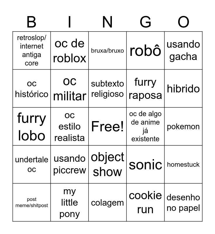 This bingo card has a free space and 24 words: usando piccrew, my little pony, subtexto religioso, post meme/shitpost, usando gacha, retroslop/ internet antiga core, oc histórico, oc de roblox, oc de algo de anime já existente, object show, furry raposa, furry lobo, sonic, homestuck, oc militar, cookie run, pokemon, bruxa/bruxo, hibrido, oc estilo realista, desenho no papel, undertale oc, robô and colagem.