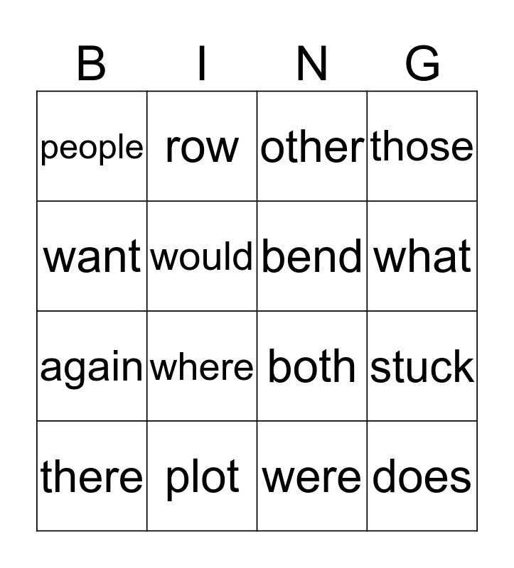 This bingo card has a free space and 15 words: there, does, other, people, what, want, where, were, would, again, stuck, those, bend, row and plot.
