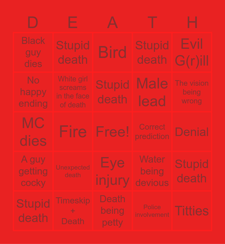This bingo card has a free space and 29 words: Stupid death, Death getting his lick back, Fire, Car, Black guy dies, Bird, White girl screams in the face of death, Unexpected death, Correct prediction, Timeskip + Death, Denial, Titties, Death being petty, Police involvement, The vision being wrong, Someone getting saved, Eye injury, A guy getting cocky, Evil G(r)ill, MC dies, Water being devious, Mutilation, Male lead, No happy ending, Stupid death, Stupid death, Stupid death, Stupid death and Stupid death.