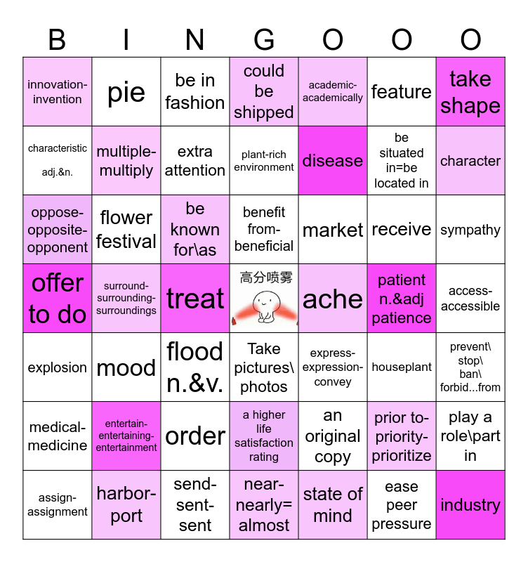 This bingo card has a free space and 48 words: an original copy, be situated in=be located in, near- nearly= almost, surround- surrounding- surroundings, be known for\as, access-accessible, pie, harbor- port, feature, Take pictures\ photos, take shape, could be shipped, receive, market, medical- medicine, patient n.&adj patience, characteristic adj.&n., character, prior to- priority- prioritize, academic- academically, disease, treat, innovation- invention, multiple- multiply, play a role\part in, extra attention, sympathy, assign- assignment, benefit from- beneficial, flower festival, ease peer pressure, ache, prevent\ stop\ ban\ forbid...from, entertain- entertaining- entertainment, offer to do, express- expression- convey, houseplant, oppose-opposite- opponent, flood n.&v., order, explosion, industry, be in fashion, send-sent-sent, plant-rich environment, a higher life satisfaction rating, mood and state of mind.