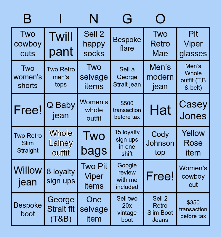 This bingo card has 36 words: Google review with me included, Two Pit Viper items, Sell two 20x vintage boot, Two women’s shorts, Two Retro Slim Straight, $500 transaction before tax, Two Retro men’s tops, One selvage item, Two Retro Mae, Free!, Men’s Whole outfit (T,B & belt), Bespoke flare, Women’s cowboy cut, Q Baby jean, Sell a George Strait jean, Two cowboy cuts, Willow jean, Hat, Free!, Sell 2 happy socks, Women’s whole outfit, Whole Lainey outfit, 15 loyalty sign ups in one shift, Two bags, Cody Johnson top, Twill pant, Men’s modern jean, George Strait fit (T&B), Two selvage items, Pit Viper glasses, $350 transaction before tax, Bespoke boot, Yellow Rose item, Casey Jones, 8 loyalty sign ups and Sell 2 Retro Slim Boot Jeans.