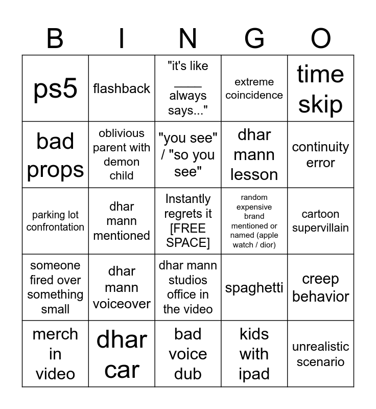 This bingo card has a free space and 24 words: dhar mann voiceover, dhar car, "you see" / "so you see", merch in video, time skip, ps5, bad props, flashback, random expensive brand mentioned or named (apple watch / dior), dhar mann studios office in the video, dhar mann lesson, parking lot confrontation, spaghetti, creep behavior, oblivious parent with demon child, kids with ipad, cartoon supervillain, "it's like ____ always says...", continuity error, dhar mann mentioned, unrealistic scenario, someone fired over something small, extreme coincidence and bad voice dub.