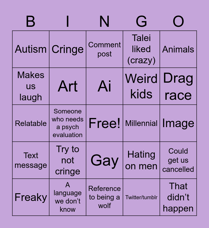 This bingo card has a free space and 24 words: Try to not cringe, A language we don’t know, Ai, Freaky, Animals, Autism, Makes us laugh, Cringe, Millennial, Gay, Weird kids, Relatable, Hating on men, Could get us cancelled, Art, Twitter/tumblr, Image, Comment post, Drag race, Someone who needs a psych evaluation, That didn’t happen, Text message, Talei liked (crazy) and Reference to being a wolf.