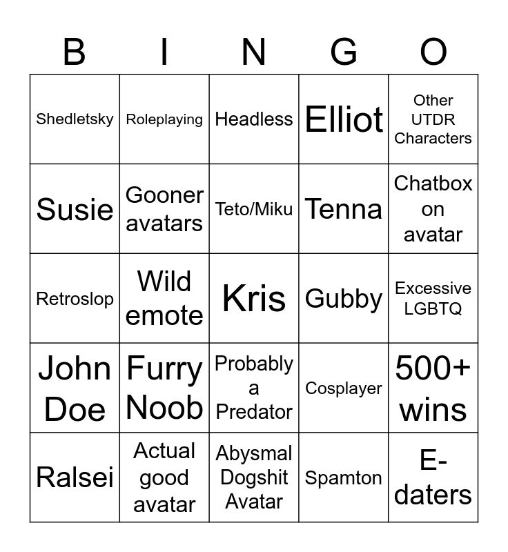 This bingo card has 25 words: Furry Noob, Abysmal Dogshit Avatar, Teto/Miku, Ralsei, Other UTDR Characters, Shedletsky, Susie, Roleplaying, Gubby, Probably a Predator, Tenna, Retroslop, Cosplayer, 500+ wins, Gooner avatars, E-daters, Excessive LGBTQ, Headless, Chatbox on avatar, Wild emote, Kris, Actual good avatar, John Doe, Elliot and Spamton.