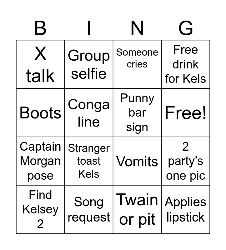 This bingo card has 17 words: Twain or pit, Find Kelsey 2, Someone cries, X talk, Stranger toast Kels, Free drink for Kels, 2 party’s one pic, Punny bar sign, Free!, Conga line, Song request, Vomits, Boots, Group selfie, Captain Morgan pose, Wrong bathroom and Applies lipstick.
