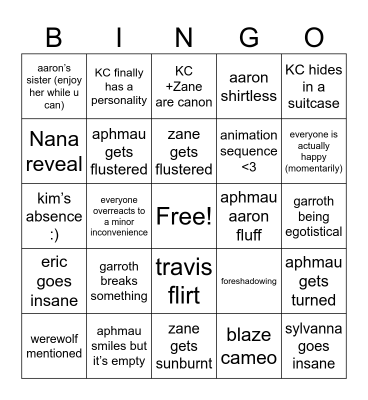 This bingo card has a free space and 24 words: garroth breaks something, aphmau smiles but it’s empty, zane gets flustered, werewolf mentioned, KC hides in a suitcase, aaron’s sister (enjoy her while u can), Nana reveal, KC finally has a personality, aphmau aaron fluff, travis flirt, animation sequence <3, kim’s absence :), foreshadowing, aphmau gets turned, aphmau gets flustered, blaze cameo, garroth being egotistical, KC +Zane are canon, everyone is actually happy (momentarily), everyone overreacts to a minor inconvenience, sylvanna goes insane, eric goes insane, aaron shirtless and zane gets sunburnt.