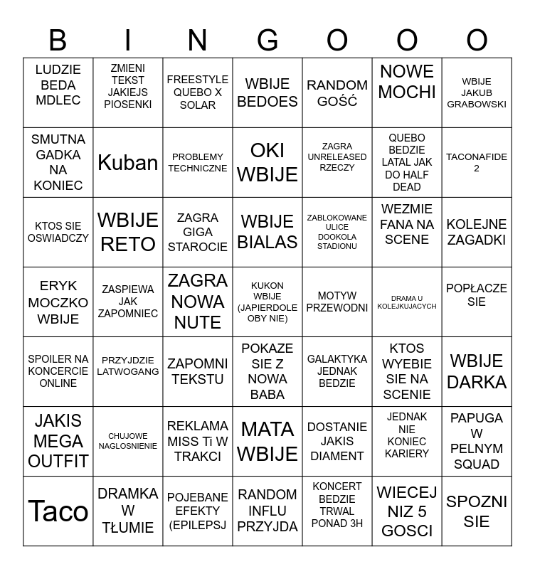 This bingo card has 49 words: JEDNAK NIE KONIEC KARIERY, QUEBO BEDZIE LATAL JAK DO HALF DEAD, KONCERT BEDZIE TRWAL PONAD 3H, ZASPIEWA JAK ZAPOMNIEC, ZAGRA GIGA STAROCIE, POPŁACZE SIE, ZMIENI TEKST JAKIEJS PIOSENKI, POJEBANE EFEKTY (EPILEPSJ, NOWE MOCHI, POKAZE SIE Z NOWA BABA, WBIJE JAKUB GRABOWSKI, WBIJE BEDOES, WEZMIE FANA NA SCENE, ZABLOKOWANE ULICE DOOKOLA STADIONU, CHUJOWE NAGLOSNIENIE, DRAMA U KOLEJKUJACYCH, SMUTNA GADKA NA KONIEC, TACONAFIDE 2, PAPUGA W PELNYM SQUAD, RANDOM GOŚĆ, ZAGRA UNRELEASED RZECZY, ZAGRA NOWA NUTE, LUDZIE BEDA MDLEC, Kuban, Taco, PROBLEMY TECHNICZNE, KOLEJNE ZAGADKI, DRAMKA W TŁUMIE, WBIJE BIALAS, WBIJE RETO, SPOZNI SIE, MOTYW PRZEWODNI, JAKIS MEGA OUTFIT, REKLAMA MISS Ti W TRAKCI, ERYK MOCZKO WBIJE, GALAKTYKA JEDNAK BEDZIE, KTOS WYEBIE SIE NA SCENIE, WBIJE DARKA, KTOS SIE OSWIADCZY, ZAPOMNI TEKSTU, MATA WBIJE, SPOILER NA KONCERCIE ONLINE, KUKON WBIJE (JAPIERDOLE OBY NIE), RANDOM INFLU PRZYJDA, OKI WBIJE, FREESTYLE QUEBO X SOLAR, DOSTANIE JAKIS DIAMENT, PRZYJDZIE LATWOGANG and WIECEJ NIZ 5 GOSCI.