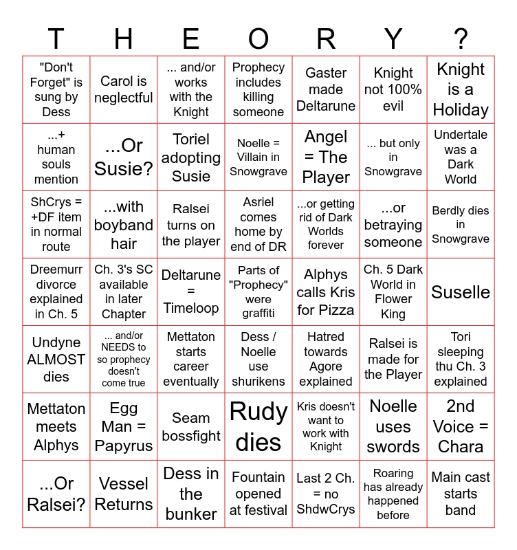 This bingo card has 49 words: Noelle uses swords, ... but only in Snowgrave, Last 2 Ch. = no ShdwCrys, Ch. 3's SC available in later Chapter, Ralsei turns on the player, Suselle, Carol is neglectful, Dess in the bunker, Knight not 100% evil, Dess / Noelle use shurikens, Knight is a Holiday, Prophecy includes killing someone, ...or betraying someone, ...or getting rid of Dark Worlds forever, Egg Man = Papyrus, Ch. 5 Dark World in Flower King, ...+ human souls mention, Undertale was a Dark World, 2nd Voice = Chara, Gaster made Deltarune, Angel = The Player, Deltarune = Timeloop, "Don't Forget" is sung by Dess, ...Or Susie?, ...Or Ralsei?, Toriel adopting Susie, Berdly dies in Snowgrave, Vessel Returns, Asriel comes home by end of DR, ...with boyband hair, Main cast starts band, Alphys calls Kris for Pizza, Mettaton meets Alphys, Seam bossfight, Dreemurr divorce explained in Ch. 5, Hatred towards Agore explained, Ralsei is made for the Player, Tori sleeping thu Ch. 3 explained, ShCrys = +DF item in normal route, Mettaton starts career eventually, Rudy dies, Undyne ALMOST dies, Parts of "Prophecy" were graffiti, Fountain opened at festival, Noelle = Villain in Snowgrave, ... and/or works with the Knight, Kris doesn't want to work with Knight, ... and/or NEEDS to so prophecy doesn't come true and Roaring has already happened before.
