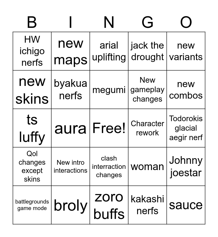 This bingo card has a free space and 24 words: New intro interactions, broly, megumi, battlegrounds game mode, new variants, HW ichigo nerfs, new skins, new maps, Character rework, clash interraction changes, New gameplay changes, ts luffy, woman, Johnny joestar, byakua nerfs, kakashi nerfs, Todorokis glacial aegir nerf, arial uplifting, new combos, aura, sauce, Qol changes except skins, jack the drought and zoro buffs.