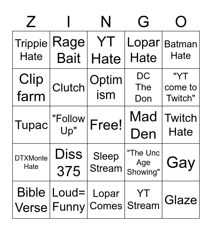This bingo card has a free space and 24 words: Diss 375, Loud= Funny, Optim ism, Bible Verse, Batman Hate, Trippie Hate, Clip farm, Rage Bait, Mad Den, Sleep Stream, DC The Don, Tupac, "The Unc Age Showing", Gay, Clutch, YT Stream, Twitch Hate, YT Hate, "YT come to Twitch", "Follow Up", Glaze, DTXMonte Hate, Lopar Hate and Lopar Comes.