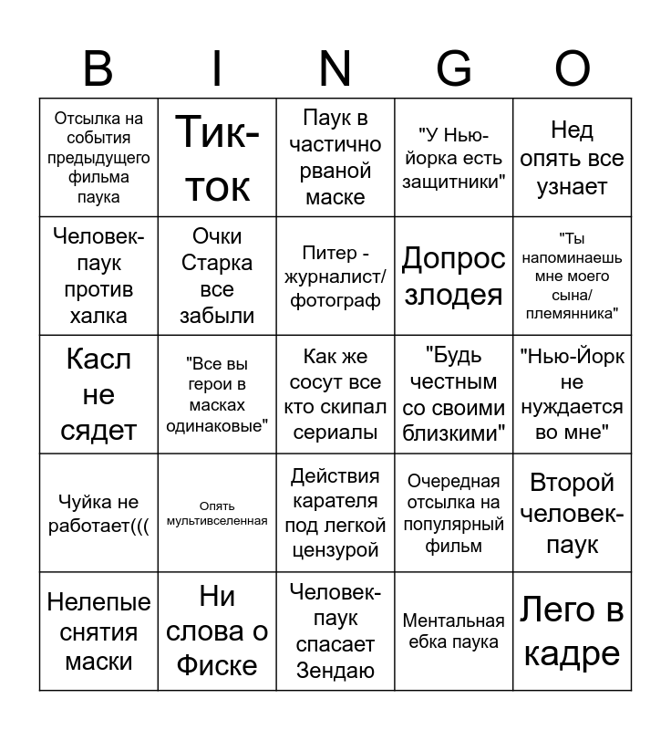 This bingo card has a free space and 24 words: Опять мультивселенная, Ни слова о Фиске, Питер - журналист/фотограф, Нелепые снятия маски, Нед опять все узнает, Отсылка на события предыдущего фильма паука, Человек-паук против халка, Тик-ток, "Будь честным со своими близкими", Действия карателя под легкой цензурой, Допрос злодея, Касл не сядет, Очередная отсылка на популярный фильм, Второй человек-паук, Очки Старка все забыли, Ментальная ебка паука, "Нью-Йорк не нуждается во мне", Паук в частично рваной маске, "Ты напоминаешь мне моего сына/племянника", "Все вы герои в масках одинаковые", Лего в кадре, Чуйка не работает(((, "У Нью-йорка есть защитники" and Человек-паук спасает Зендаю.