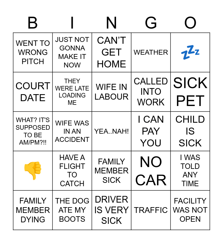 This bingo card has a free space and 25 words: HAVE A FLIGHT TO CATCH, DRIVER IS VERY SICK, WIFE IN LABOUR, FAMILY MEMBER DYING, π€, WENT TO WRONG PITCH, COURT DATE, JUST NOT GONNA MAKE IT NOW, I CAN PAY YOU, FAMILY MEMBER SICK, CALLED INTO WORK, WHAT? IT'S SUPPOSED TO BE AM/PM?!!, NO CAR, I WAS TOLD ANY TIME, THEY WERE LATE LOADING ME, CAR BROKE DOWN, CHILD IS SICK, CANβT GET HOME, SICK PET, WIFE WAS IN AN ACCIDENT, FACILITY WAS NOT OPEN, THE DOG ATE MY BOOTS, π, WEATHER and TRAFFIC.