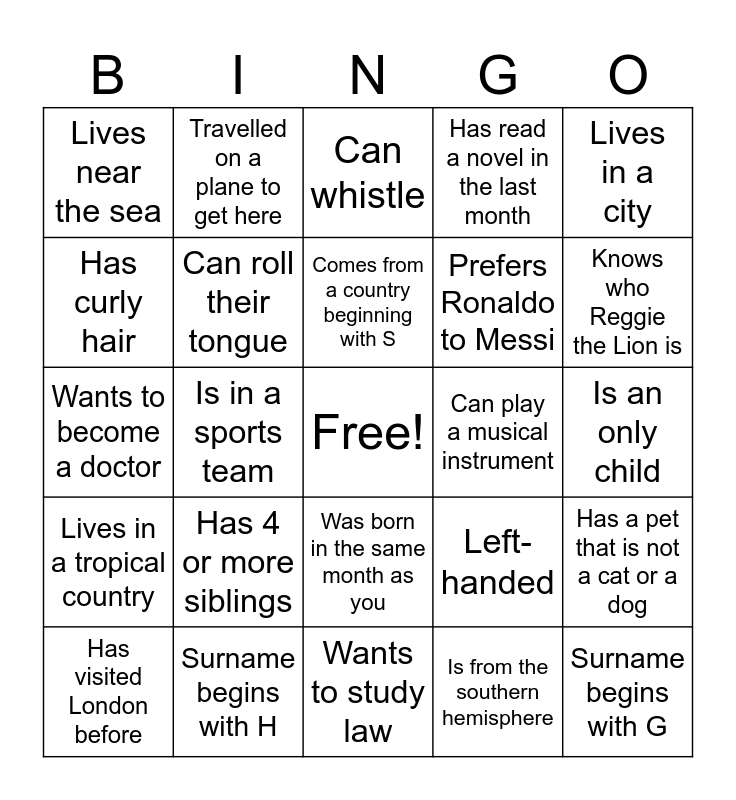 This bingo card has a free space and 24 words: Has 4 or more siblings, Surname begins with H, Comes from a country beginning with S, Has visited London before, Lives in a city, Lives near the sea, Has curly hair, Travelled on a plane to get here, Can play a musical instrument, Was born in the same month as you, Prefers Ronaldo to Messi, Wants to become a doctor, Left-handed, Has a pet that is not a cat or a dog, Can roll their tongue, Is from the southern hemisphere, Is an only child, Can whistle, Knows who Reggie the Lion is, Is in a sports team, Surname begins with G, Lives in a tropical country, Has read a novel in the last month and Wants to study law.