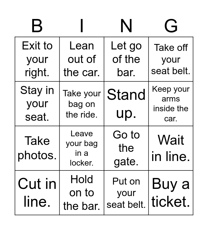 This bingo card has 17 words: Put on your seat belt., Cut in line., Let go of the bar., Exit to your right., Leave your bag in a locker., Take off your seat belt., Wait in line., Stand up., Keep your arms inside the car., Take your bag on the ride., Hold on to the bar., Go to the gate., Stay in your seat., Lean out of the car., Take photos., Push. and Buy a ticket..