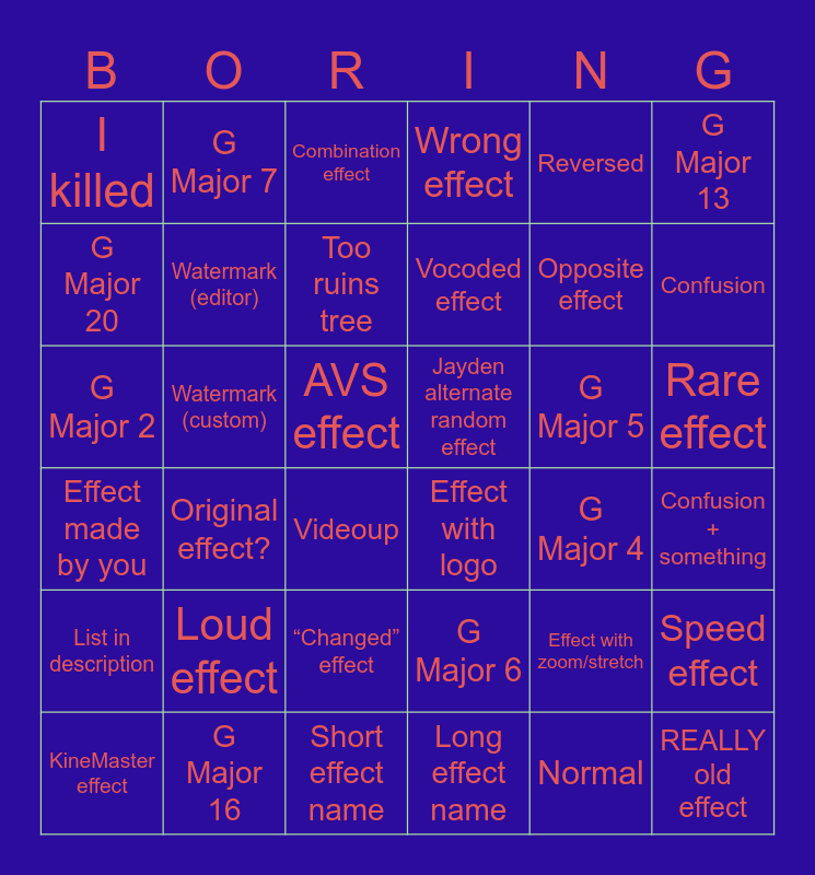 This bingo card has 48 words: G Major 1, G Major 2, G Major 3, G Major 4, G Major 5, G Major 6, G Major 7, G Major, G Major 13, G Major 16, G Major 20, Wrong effect, Original effect?, Effect made by you, REALLY old effect, “Changed” effect, Watermark (editor), Watermark (custom), Contains effects (free space), Reversed, Confusion, Confusion + something, I killed, Too ruins tree, KineMaster effect, Vocoded effect, Videoup, 4ormulator, Rare effect, Jayden alternate random effect, IL vocodex effect, Loud effect, Normal, Emotion effect, Effect with logo, Short effect name, Long effect name, AVS effect, KineMaster effect, MegaPhoto effect, Effect with zoom/stretch, List in description, Combination effect, Other letter major, Opposite effect, Effect originating from a mine song, Speed effect and G Major 74.