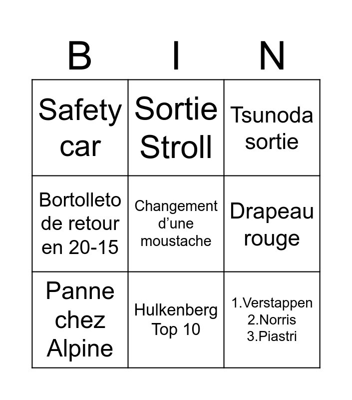 This bingo card has a free space and 8 words: Drapeau rouge, Tsunoda sortie, Sortie Stroll, Panne chez Alpine, Safety car, 1.Verstappen 2.Norris 3.Piastri, Bortolleto de retour en 20-15 and Hulkenberg Top 10.