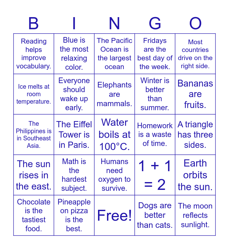 This bingo card has 25 words: The sun rises in the east., Pineapple on pizza is the best., Water boils at 100°C., Dogs are better than cats., Most countries drive on the right side., Reading helps improve vocabulary., Blue is the most relaxing color., The Pacific Ocean is the largest ocean, Homework is a waste of time., Earth orbits the sun., Ice melts at room temperature., Everyone should wake up early., Free!, 1 + 1 = 2, Bananas are fruits., Chocolate is the tastiest food., The Eiffel Tower is in Paris., Elephants are mammals., Winter is better than summer., A triangle has three sides., The Philippines is in Southeast Asia., Math is the hardest subject., Humans need oxygen to survive., Fridays are the best day of the week. and The moon reflects sunlight..