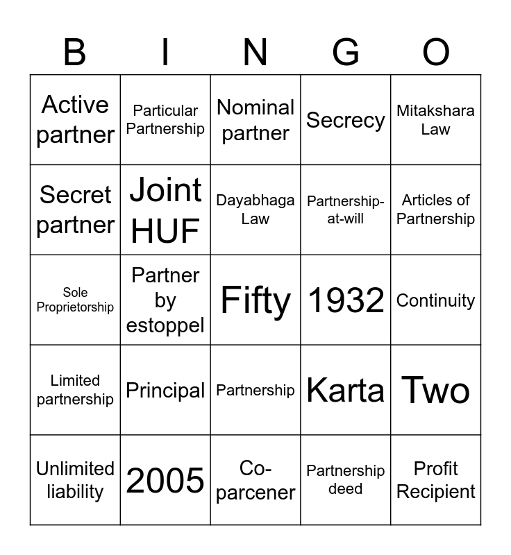 This bingo card has 25 words: Limited partnership, 2005, Fifty, Partnership deed, Mitakshara Law, Active partner, Particular Partnership, Nominal partner, 1932, Two, Secret partner, Joint HUF, Co-parcener, Karta, Articles of Partnership, Unlimited liability, Partner by estoppel, Dayabhaga Law, Partnership-at-will, Continuity, Sole Proprietorship, Principal, Partnership, Secrecy and Profit Recipient.