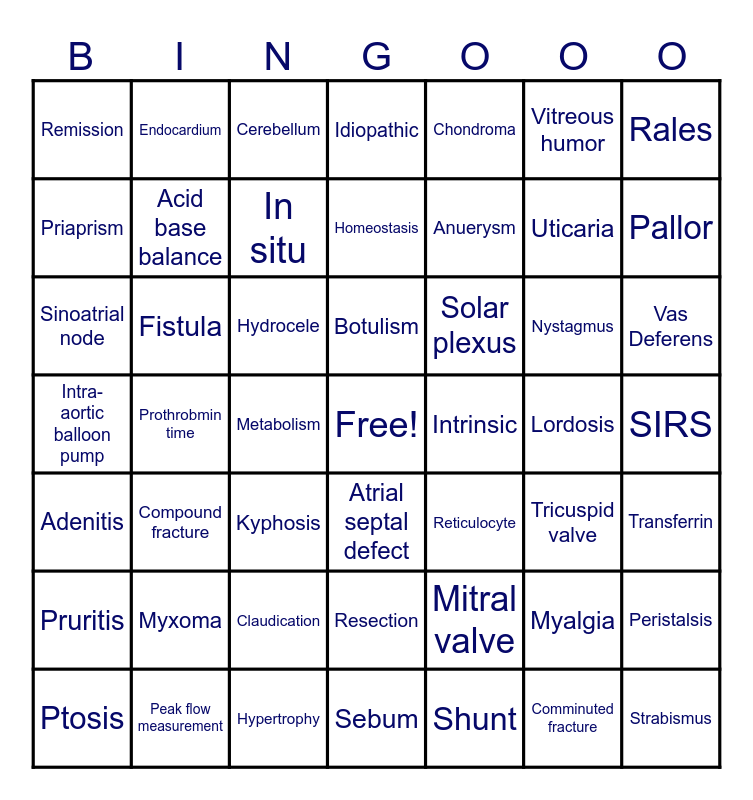 This bingo card has a free space and 48 words: Mitral valve, Uticaria, Sebum, Prothrobmin time, Hydrocele, SIRS, Endocardium, Peak flow measurement, Vitreous humor, Atrial septal defect, Rales, Idiopathic, Nystagmus, Solar plexus, Pruritis, Lordosis, Priaprism, Pallor, Myalgia, Chondroma, Anuerysm, Metabolism, Remission, Acid base balance, Peristalsis, In situ, Vas Deferens, Ptosis, Botulism, Fistula, Comminuted fracture, Intrinsic, Transferrin, Myxoma, Intra-aortic balloon pump, Reticulocyte, Tricuspid valve, Sinoatrial node, Kyphosis, Claudication, Adenitis, Strabismus, Cerebellum, Hypertrophy, Homeostasis, Resection, Compound fracture and Shunt.