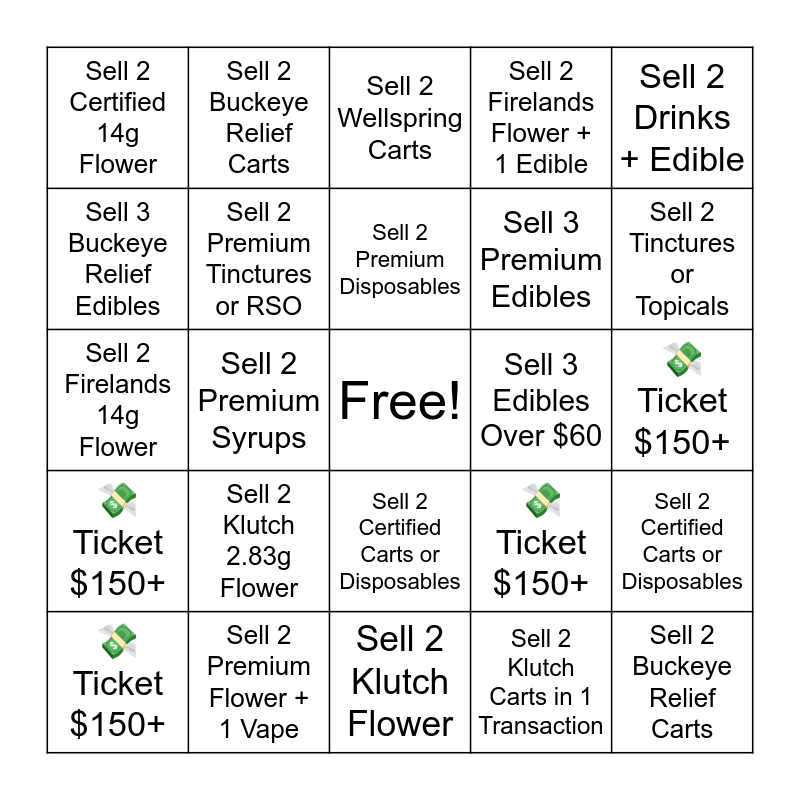 This bingo card has a free space and 24 words: 💸 Ticket $150+, Sell 2 Klutch 2.83g Flower, Sell 2 Premium Disposables, Sell 2 Klutch Carts in 1 Transaction, Sell 2 Drinks + Edible, Sell 2 Certified 14g Flower, Sell 2 Buckeye Relief Carts, Sell 2 Wellspring Carts, Sell 3 Edibles Over $60, 💸 Ticket $150+, Sell 2 Firelands 14g Flower, Sell 2 Premium Tinctures or RSO, 💸 Ticket $150+, Sell 2 Certified Carts or Disposables, Sell 3 Buckeye Relief Edibles, Sell 2 Premium Flower + 1 Vape, Sell 2 Klutch Flower, Sell 2 Firelands Flower + 1 Edible, Sell 2 Tinctures or Topicals, 💸 Ticket $150+, Sell 2 Premium Syrups, Sell 2 Certified Carts or Disposables, Sell 3 Premium Edibles and Sell 2 Buckeye Relief Carts.